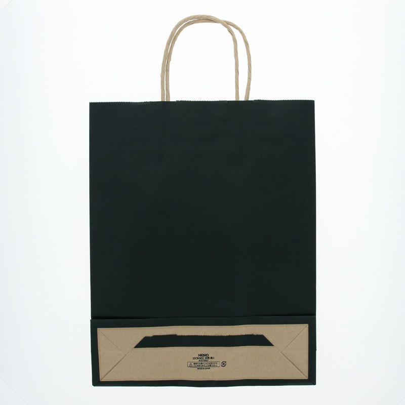 クラフト紙に黒ベタを印刷した手提げ紙袋です。色落ちを緩和させるために、上からニスを塗布しています。A4サイズの収納に適した規格です。