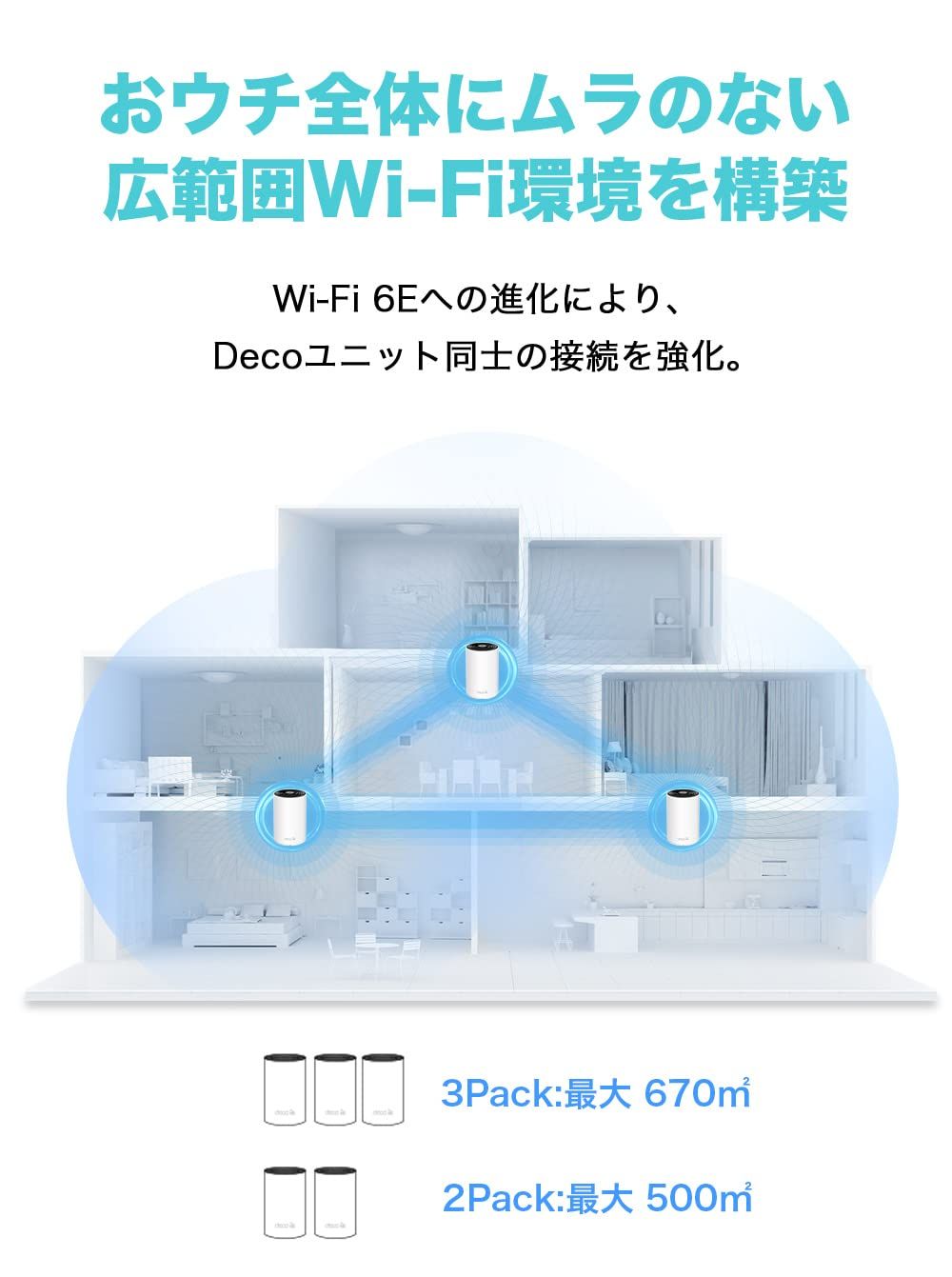 6GHzにより、新次元のメッシュWi-Fi環境を体感。既存のDecoとの併用も可能。[規格値] 6GHz:2402 Mbps (802.11ax, HE160)