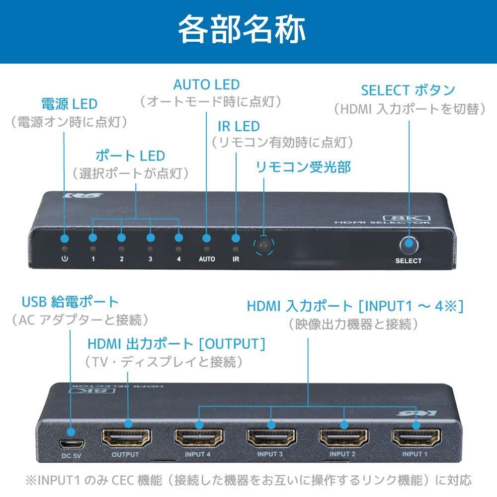 本製品は、最新のゲーム機や映像出力機器など「HDMI機器4台」を切り替えて出力できるセレクターです。 フルHDの16倍の画素数をもつ8K映像やダイナミックな4K映像もそのまま楽しむことができます。 「8K対応HDMI端子」「4K120Hz対応HDMI端子」を1ポートしかもたないテレビやディスプレイでも、最大4台のHDMI機器を同時接続。自動切替と手動切替(本体スイッチ/添付リモコン)で、ゲーム機や映像機器を簡単に切り替えられます。