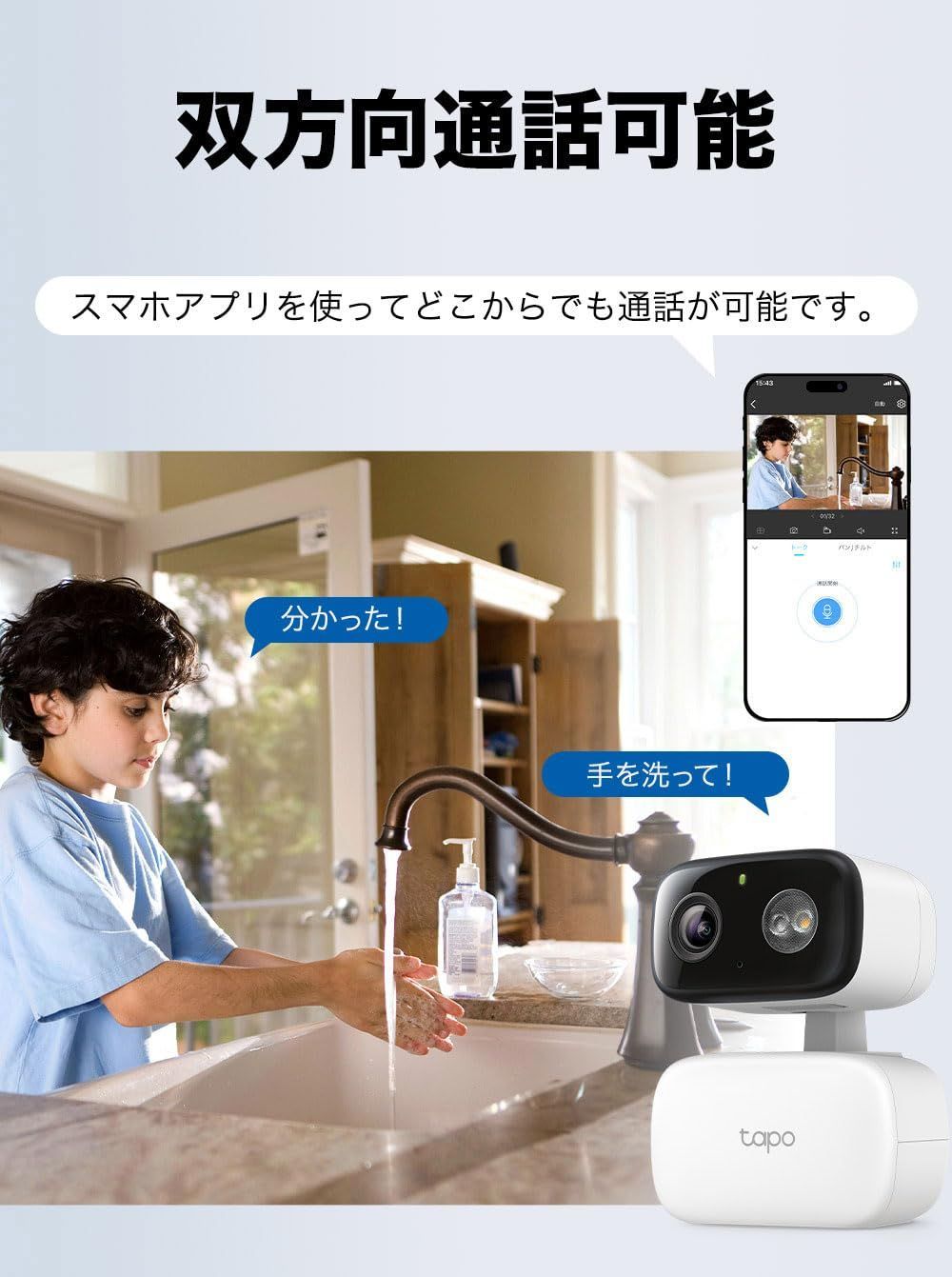 【相互音声会話】スマートフォンからカメラを通して、リアルタイムで通話が可能。外出先からの声かけや、不審者への音声警告など、セキュリティ用途にも安心してご活用いただけます。