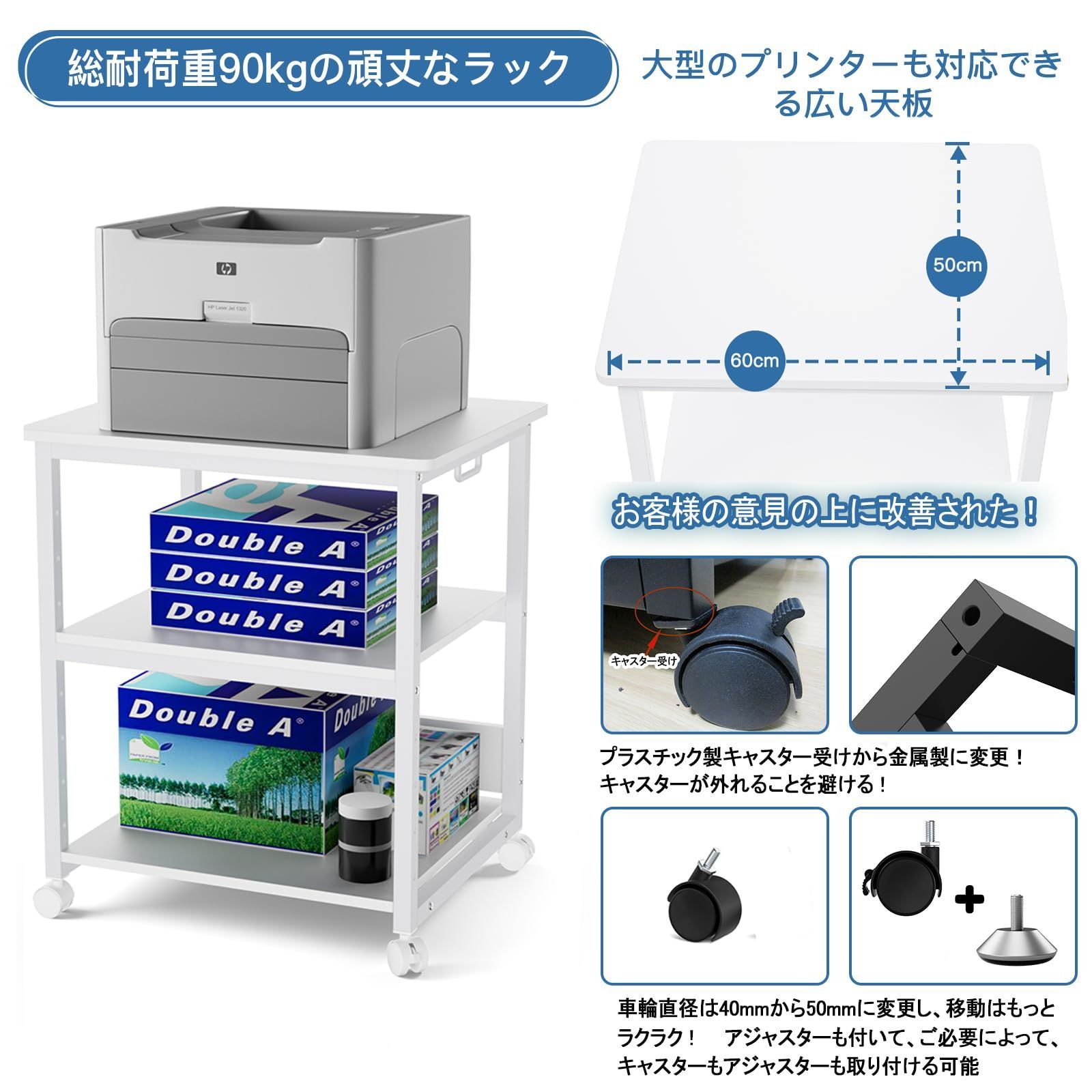 [総耐荷重90kgで支える・幅60×奥行50㎝の広い天板] ★堅牢なスチールフレームを採用した、頑丈な3段プリンタ台です。総耐荷重はなんと90kg!インクジェット複合機や事務用品のストック等、重いものを載せてもしっかり支えます。 ★オフィスで使用する大型のレーザープリンタもOKの広い天板を装備。収納はたっぷりあるので、上段にレーザープリンタ、中段にはコピー用紙や交換用トナーやインクなどの消耗品、下段にインクジェットプリンターやA4ファイルを置いて自由に収納できます。