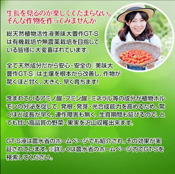 全て天然成分だから安心・安全の美味大豊作GT-Sは土壌を根本から改善し、作物が驚くほど甘く、大きく、早く育ちます!含まれているアミノ酸・フミン酸・ミネラル等の成分が植物ホルモンの分泌を促して、発根・発芽・光合成能力を高めるため、驚くほど成長が早く、連作障害も無く、生育期間も延びるので、糖度が高くしかも作物本来の風味を損なわない高品質の野菜・果実を沢山収穫出来ます。GT-S液は農水省のホームページでも紹介され、その効果が実証されています。