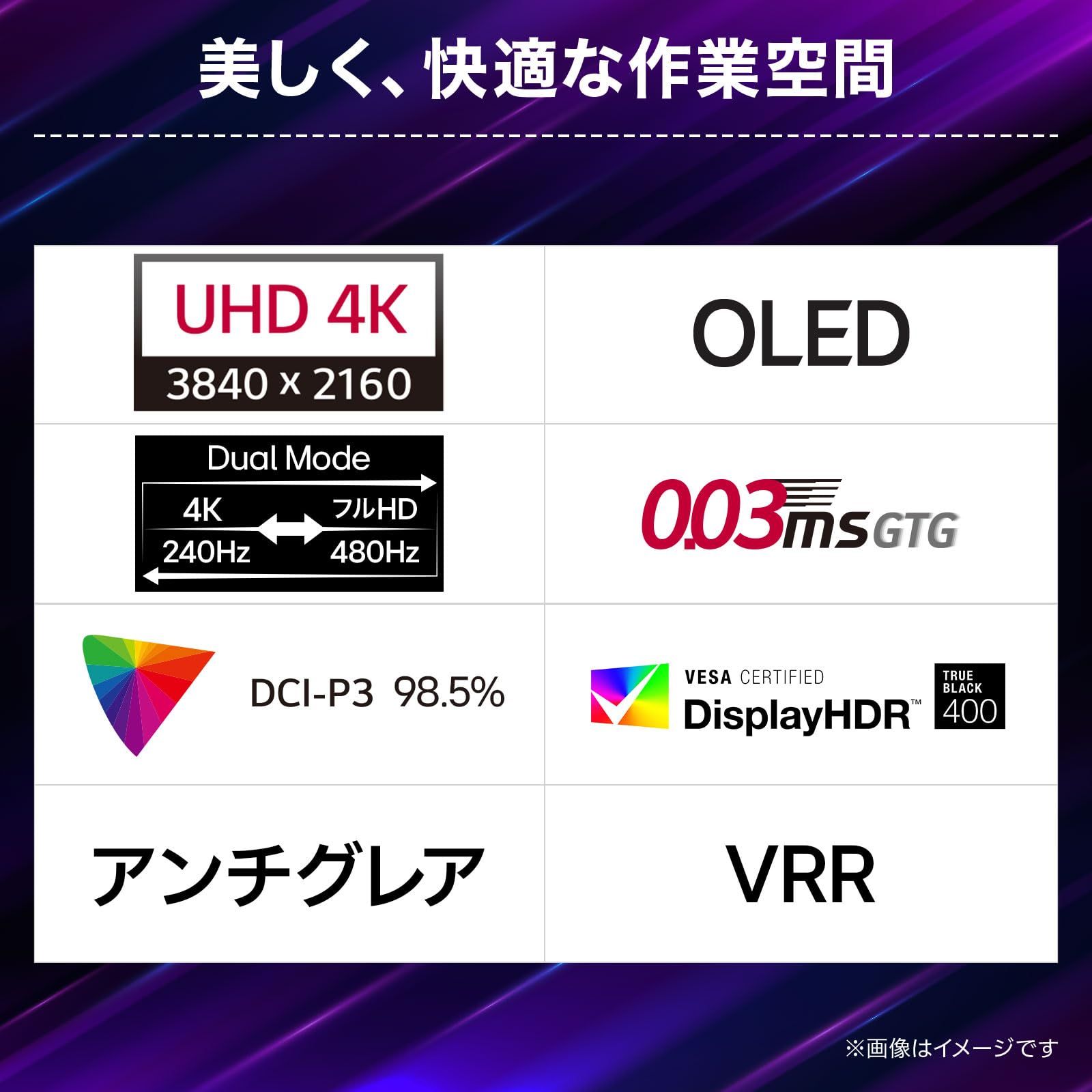 自発光で光を調整できる有機ELだからこそ実現した0.03msという驚異的な応答速度は、モーションブラー(ぼやけ)をほとんど感じさせないクッキリとした表示を提供します。統一基準として策定されたVESA