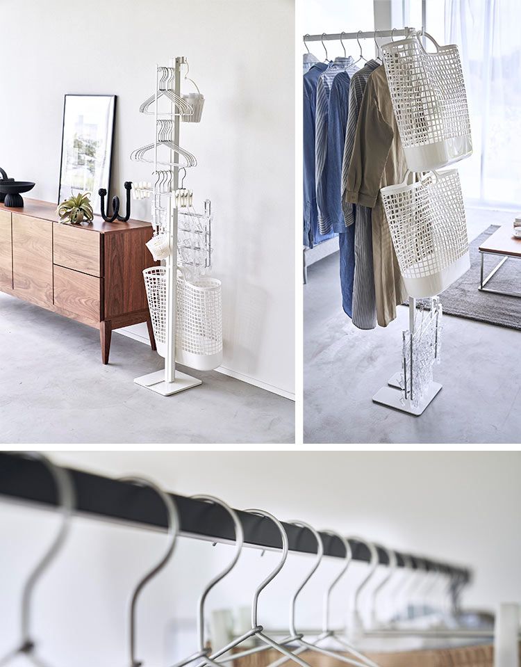 使わない時は折りたたんで収納できる室内物干しです。雨の日、夜間の洗濯など外干しができない日も安心。支柱には様々な用途で使用できるフック付き。乾きやすい場所で自由に設置できて、使わない時は折り畳んでコンパクトに収納できます。