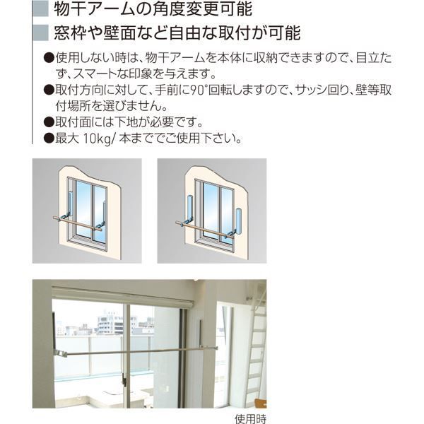 使用しない時は、物干アームを本体に収納できますので、目立たず、スマートな印象を与えます。取付方向に対して、左右に90°回転しますので、サッシ回り、壁等取付場所を選びません。