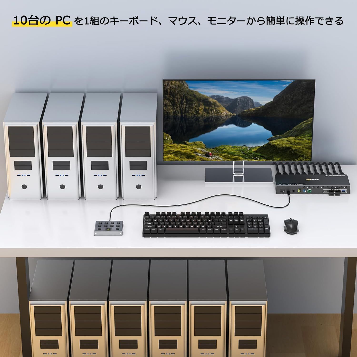 【10入力1出力HDMI KVMスイッチ】この10入力のKVMスイッチは、最大10台のパソコンを1つのモニターと1セットの有線またはワイヤレスのキーボード・マウスで共有可能。本体ボタン、付属の手元スイッチ、またはRS232で簡単に10台のパソコンを切り替えられ、4つのUSB 3.0デバイスも共有できます。