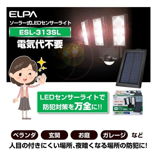 ELPA エルパ 防犯ライト ソーラー充電式センサーライト 3灯 1000ルーメン ESL 313 SL 2662212