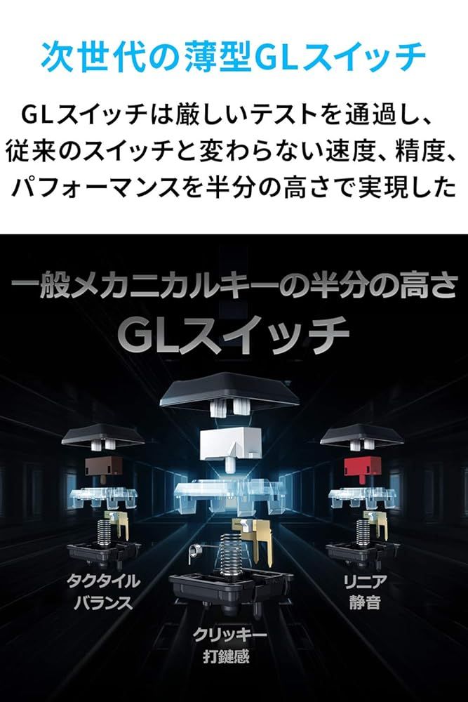 ・【高度なコンパクト メカニカルGLスイッチ】G913 TKLは、高パフォーマンスのコンパクトGLメカニカル スイッチを搭載。従来のスイッチと変わらない速度、精度、パフォーマンスを半分の高さで実現しました。当社のGLスイッチは厳しいテストを通過し、非常に高い耐久性、反応性、精度要件を満たしています。リニアスイッチのスムーズな動作は、ダブルタップと素早い連続キーストロークに優れ、MMOやアクションゲームに理想的です。