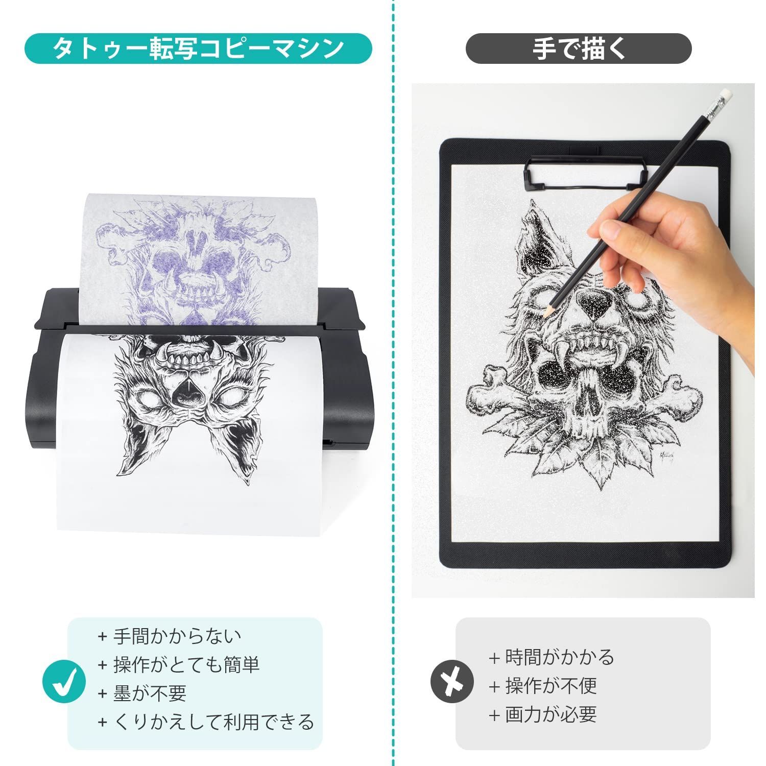 【タトゥー下絵転写用】:30分のトレース時間を節約!これ1台で手間かからずに施術したいタトゥーのデザインを速やかに転写できる!【省スペースで置けるコンパクトボディー】従来品よりコンパクトで携帯性の高いです。【サーマル式】サーマル技術を採用して、インクなとの消耗品は要りません。