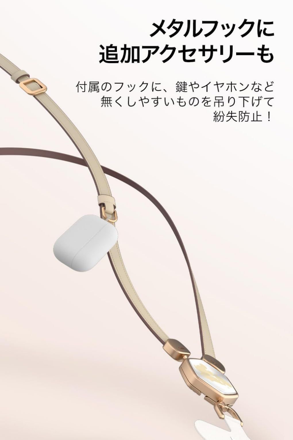 【ハンズフリーを実現】付属フックでAir Podsや鍵などの小物も吊り下げ可能