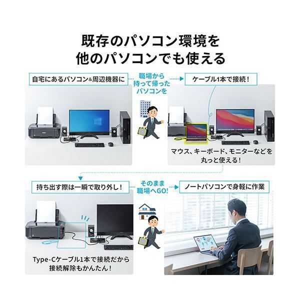 ●例えば、自宅で使用しているパソコンのHDMIディスプレイ・キーボード・マウスなどの環境を活かしたまま、テレワークなどで持ち帰ったType-C接続のノートパソコンを切り替えて操作できます。