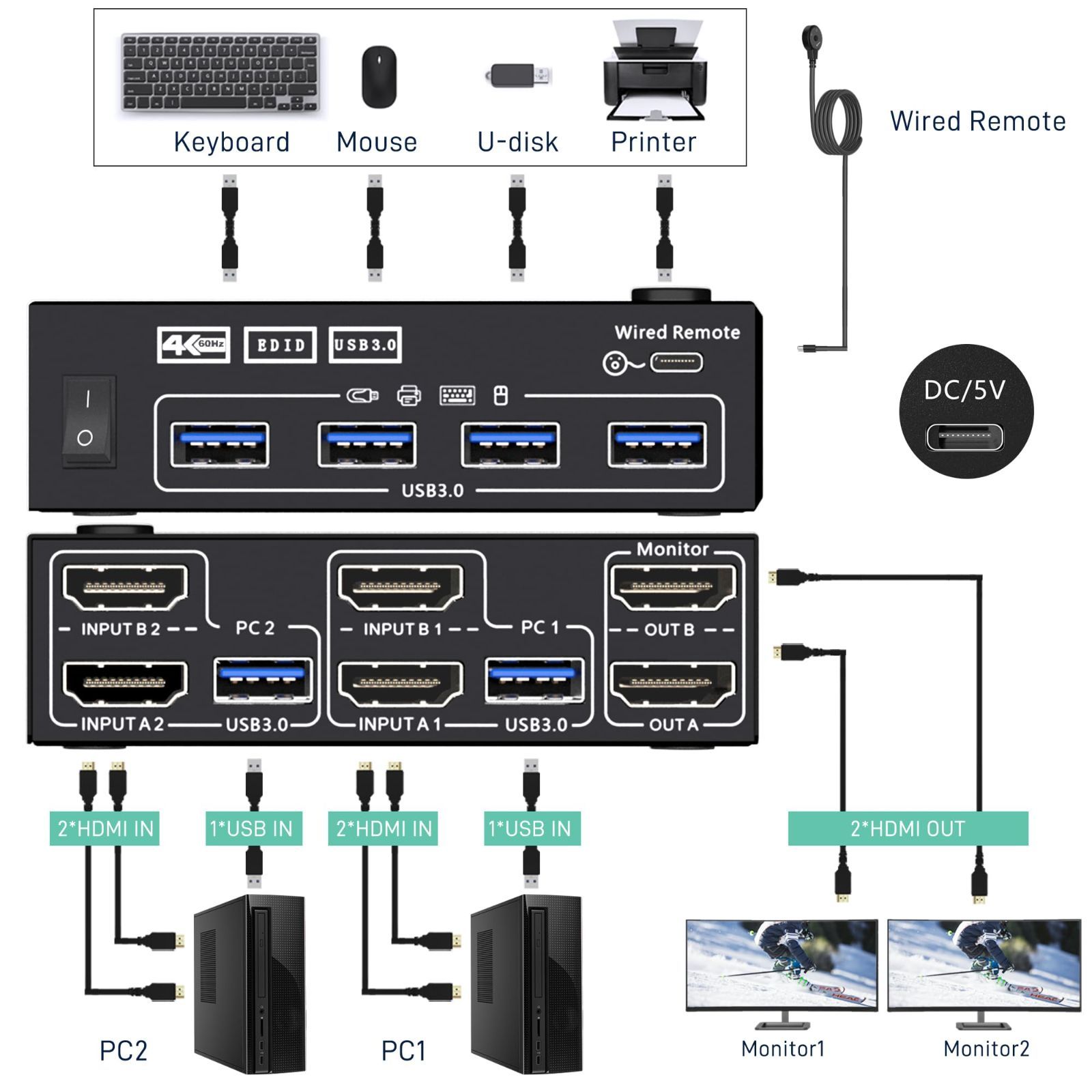 デュアル モニター HDMI KVM 切替器 4K@60Hz 2ポート拡張ディスプレイ USB3.0 KVM HDMIスイッチ2PC 2モニター共有 マウス キーボード (外部電源スイッチ/1.5m切替延長ボタン)
