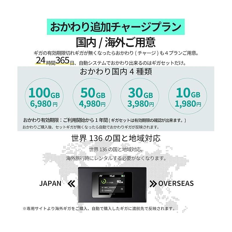 ギガセット チャージ型 ポケットWiFi 日付 契約不要 月額費用無し 24時間 ギガ リチャージ WiFiルーター クルマ利用 海外利用も可 電源付けるだけですぐ利用
