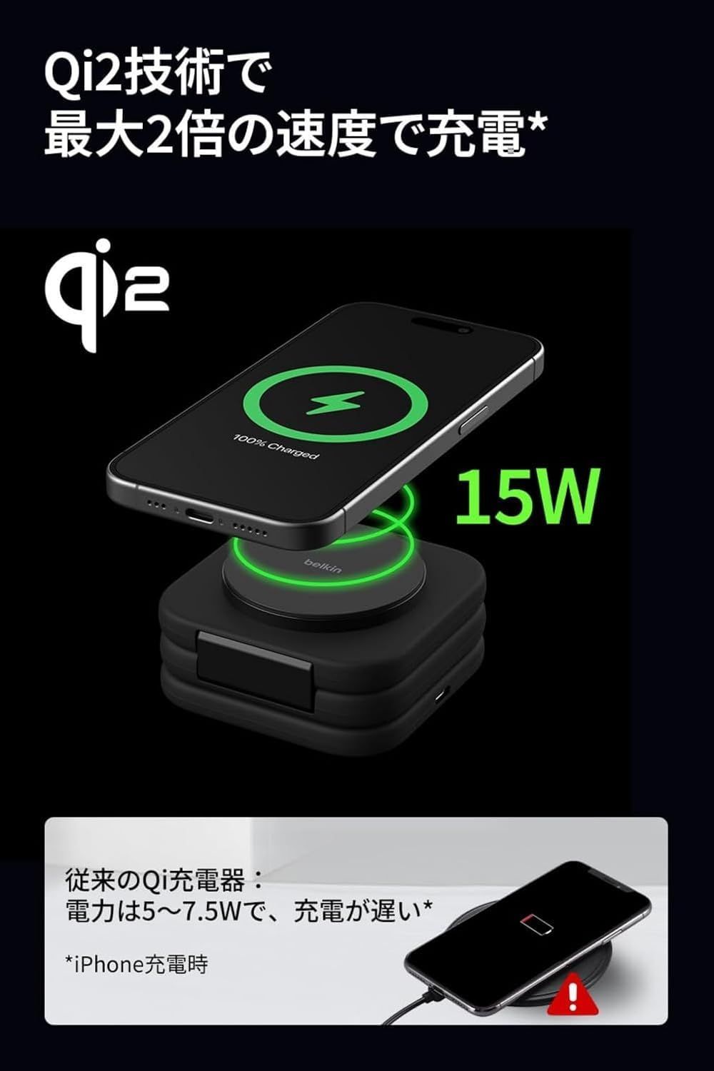Belkin 3-in-1 ワイヤレス充電 ポータブルパッド Qi 2認証 MagSafe対応 iPhone 16~12 スマホ 最大15 W高速充電 Apple Watch 10~7 Ultra 2 急速充電対応 USB-Cケーブル付