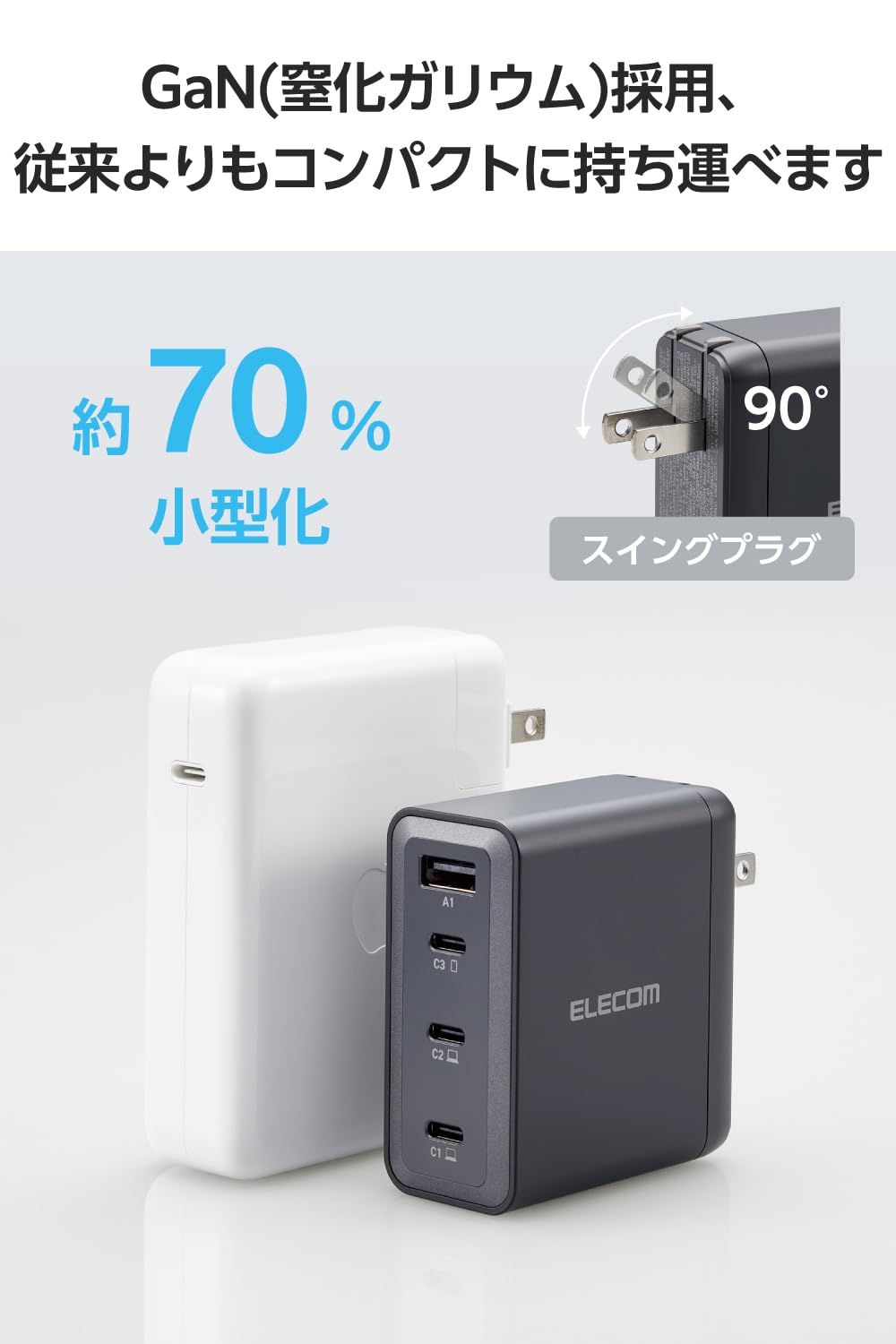 Delivery規格100Wまでで充電できる機器に限ります。ノートパソコン付属のACアダプターと違い必要な長さのケーブルを選んで使えるから、長すぎるケーブルでごちゃつきがちなデスク周りもこれですっきり。スペースを広々使えます。4ポート利用時も合計最大149Wの高出力、最大65W&60W&12W&12Wでノートパソコン、タブレット、スマートフォンなどを4台同時に充電できます。複数ポートを備えているため、使用する差込口(コンセント)が足りない場所でも困りません。ビジネスでの外出や出張、リモートワーク、旅行などの宿泊先、混雑しているカフェやコワーキングスペースでも便利な1台です。GaN(窒化ガリウム)を採用し、高出力ながらコンパクトサイズを実現。プラグ部分も折り畳むことができるため、バッグの中でもスペースを取らず、持ち歩きにも便利です。USB