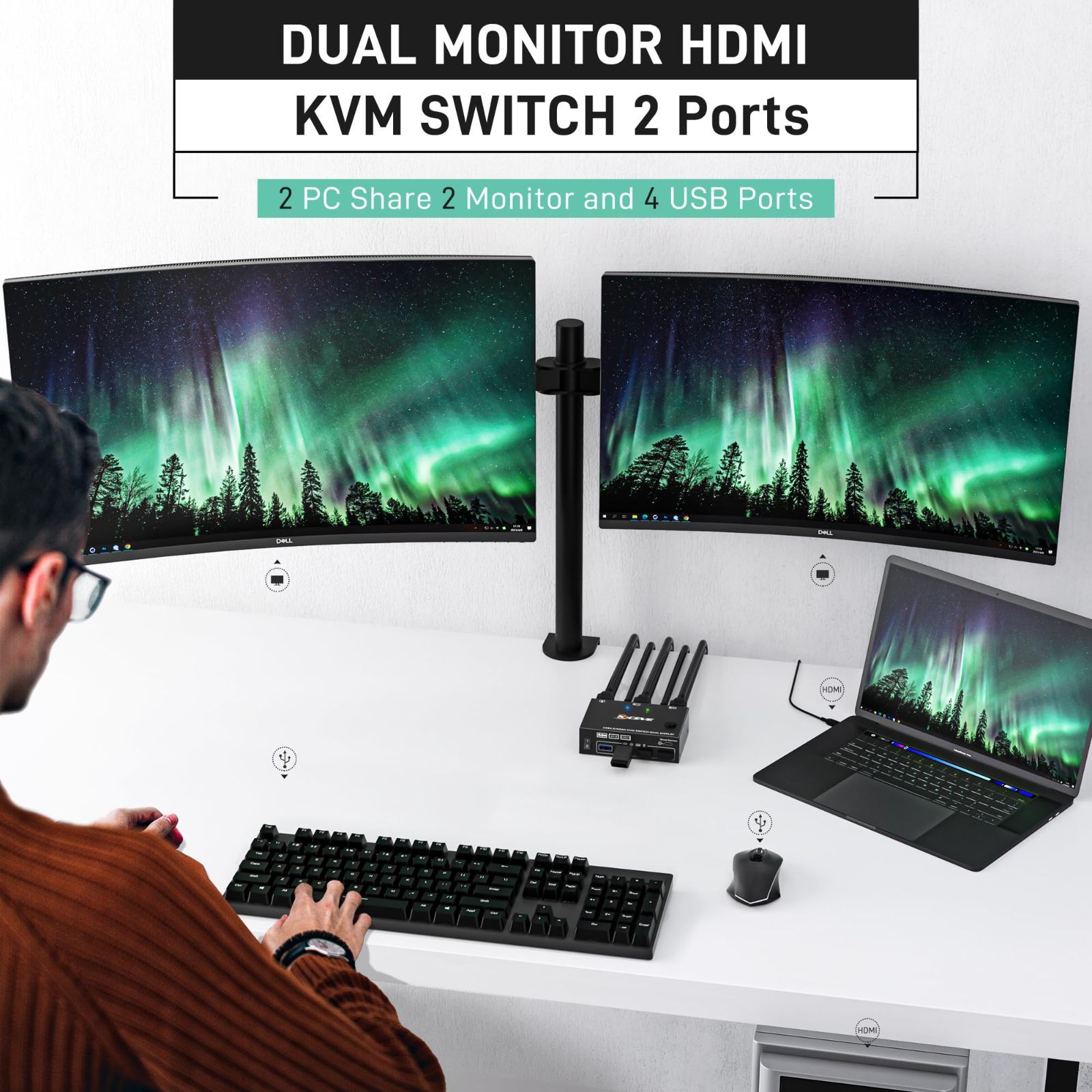 ★【デュアルモニターKVM HDMI スイッチ】このデュアルモニターHDMI KVM 切替器は、1セットのUSBキーボードとマウスで2台のPCを制御し、2台のモニターを共有することができます。 このデュアル ディスプレイ KVM スイッチを使用すると、デスクトップがすっきり整然としたものになります。