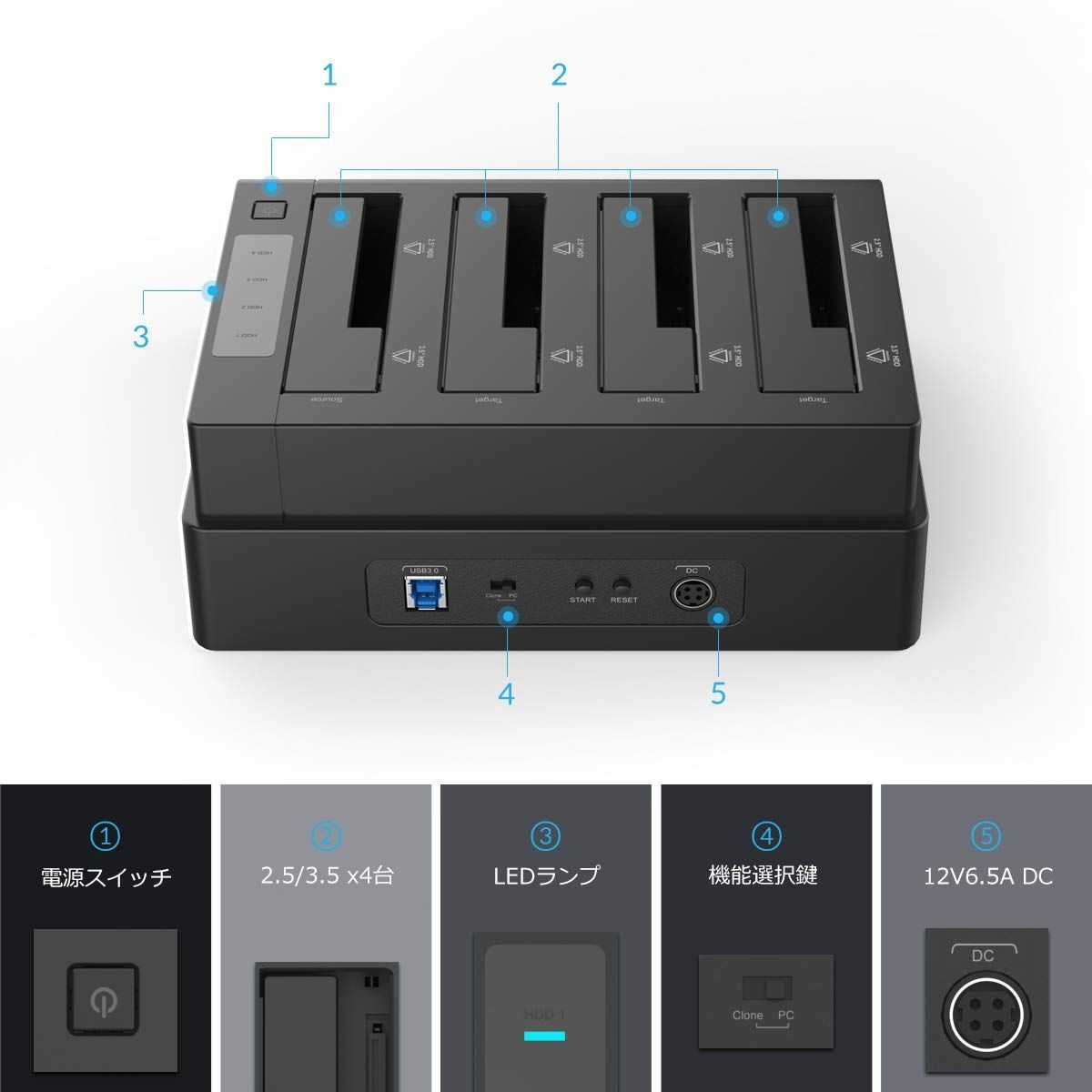 【クローン機能】2.5インチと3.5インチのSATAハードディスクを4台まで搭載可能、合計40TBの容量対応します。パソコンなしでハードディスクのまるごとコピー機能あり、1台から同時に3台にデータをコピーすることができます。