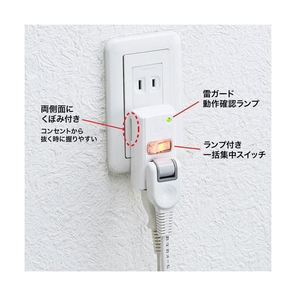 落雷による雷サージからパソコンや電化製品などを守る雷ガードタップ。
