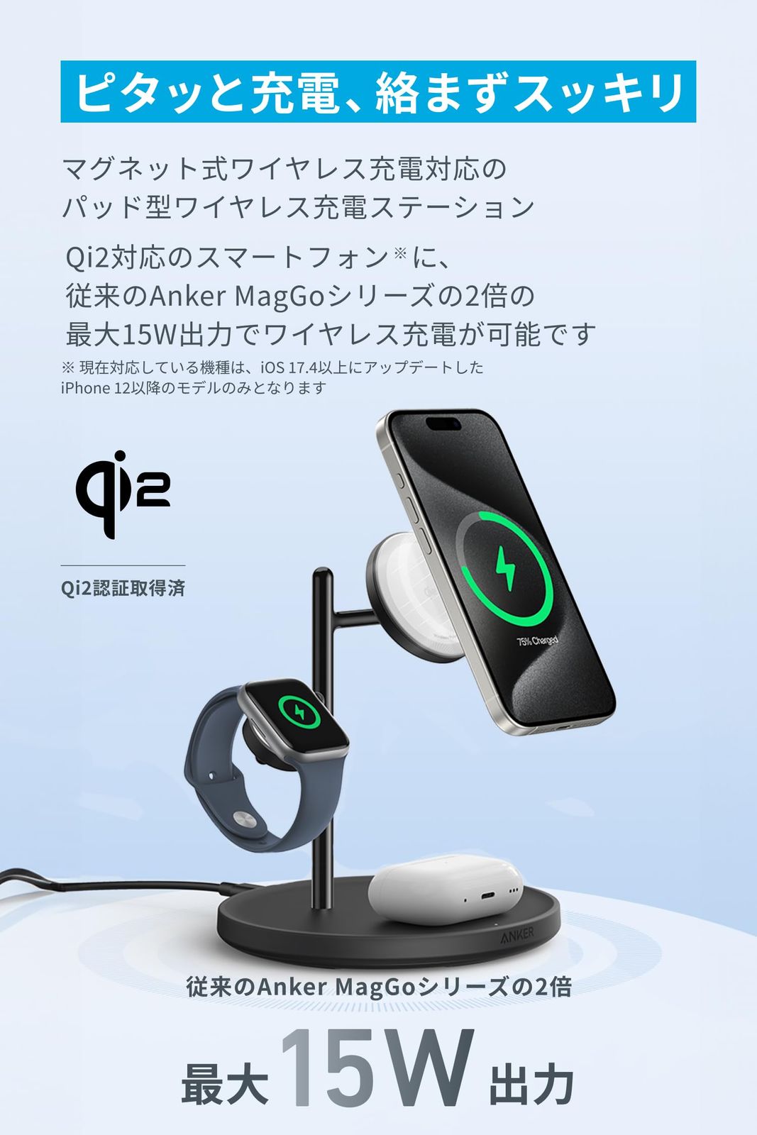 ピタッと充電、絡まずスッキリ:マグネット式ワイヤレス充電対応の3-in-1充電器。Qi2対応のスマートフォンに従来のAnker MagGoシリーズの2倍の最大15W出力でワイヤレス充電が可能です。(※ 現在対応している機種は、iOS 17.4以上にアップデートしたiPhone 12以降のモデル のみとなります)