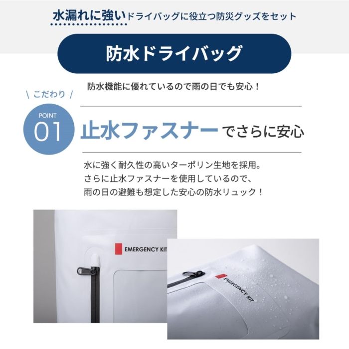 防水ドライバッグ(約φ250×600mm)×1、水に流せるポケットティッシュ・防災ガイドブック・ヘルメット・乾電池式ヘッドライト・アルカリ保存水(500ml)・ブルーシート・軍手・給水バッグ(5リットル)・絆創膏&綿棒セット・ウェットティッシュ(5年保存)・紙皿(おわん型)(10枚入)・エアークッション・静音アルミブランケット・使い捨てカイロ・7年保存クッキー・ゴミ袋半透明45リットル(10枚入)×各1、携帯トイレ(1回分)・使い捨てマスク×各2、完封割箸×3