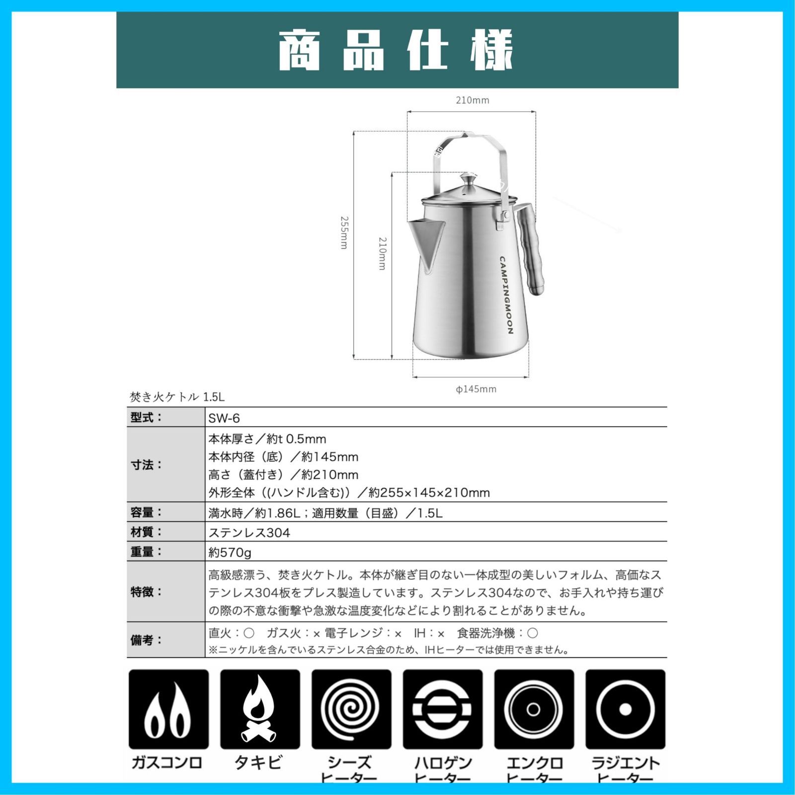 キャンピングムーン CAMPING MOON 焚き火 ケトル 直火 ファイアープレイスケトル キャンプケトル 一体成形 ステンレス304 1 5 L SW 6