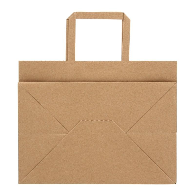 ハンドルは一般的な平紐の幅10mm幅よりも太めの12mm幅を採用しているので、手にやさしく持ちやすい紙袋です。オーソドックスなクラフト無地なので、催事など色々な用途でご使用頂けます。