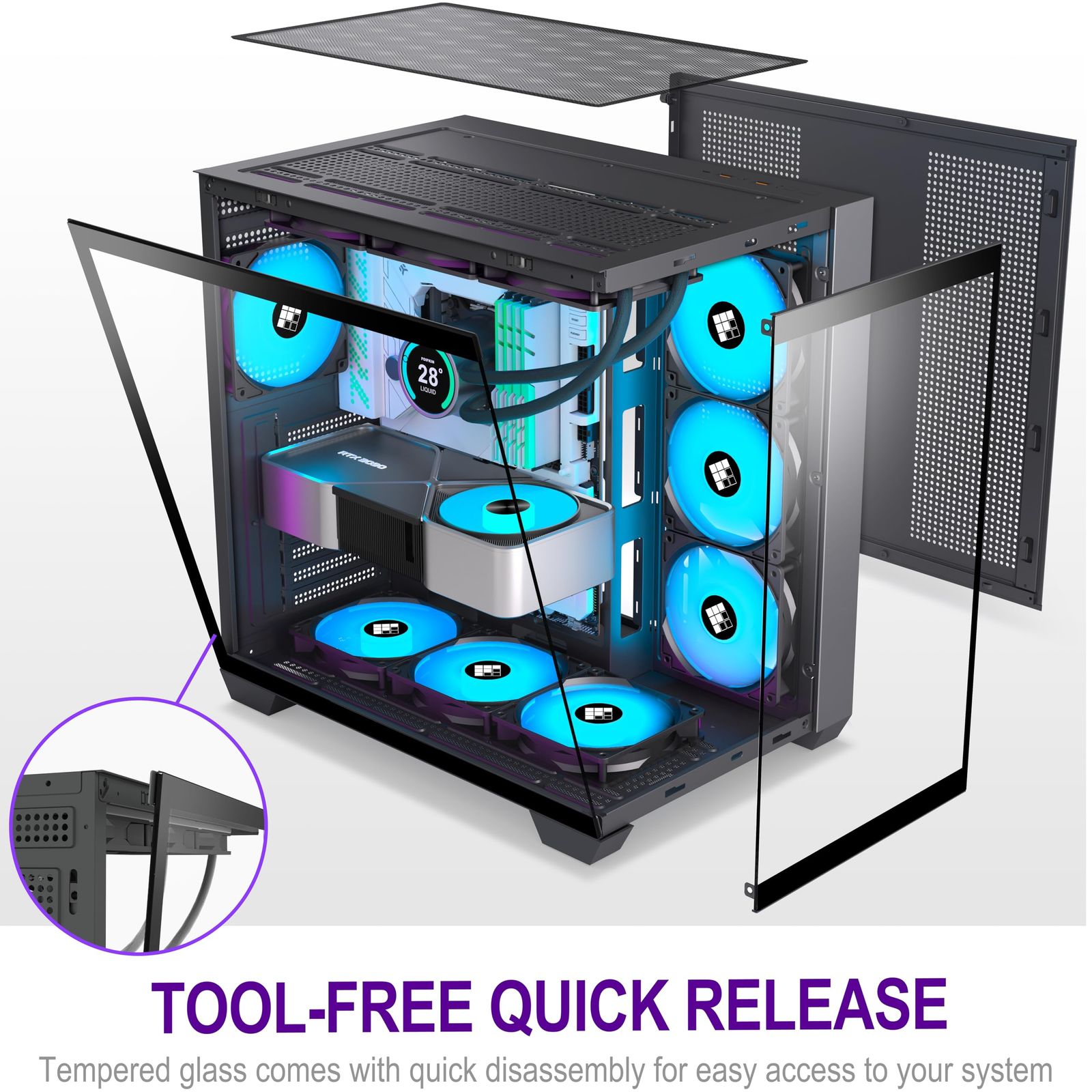 【270°パノラマデュアルキャビンデザイン】FOIFKIN F600 PCケースは、なめらかでモダンなデザインを採用し、270°のパノラマ強化ガラスパネルで構成された広い視野を実現します。完全に透明なガラスカーテンウォールのデザインは、ハイエンドのハードウェアコンポーネントに高品質のディスプレイプラットフォームを提供します。強化ガラスは遮音性に優れており、オフィス/ゲーム環境での快適性が高く、工具を必要とせず、分解が簡単です。