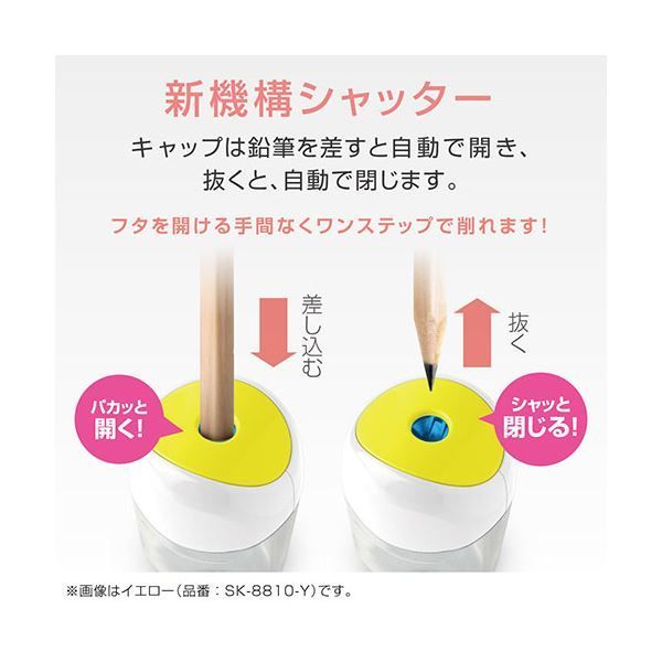 いつでもどこでもだれでもワンタッチで削れるもっとも簡単なハンディ鉛筆削りラチェット式削りで、左右交互にひねるだけでカンタンに削れます。新機構!シャッターキャップは鉛筆を差すと自動でパカッと開き、抜くと、シャッと自動で閉じます。フタを開ける手間なくワンステップで削れます!