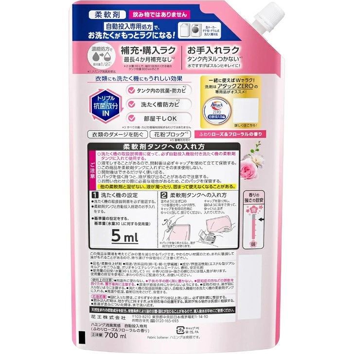 ハミング 消臭実感 自動投入 詰め替え 柔軟剤 洗濯 補充 お手入れ ラク 濃縮 液体 部屋干し カビ タテ型 ドラム式 キレイ 清潔 ふわりローズ フローラルの香り 700 ml