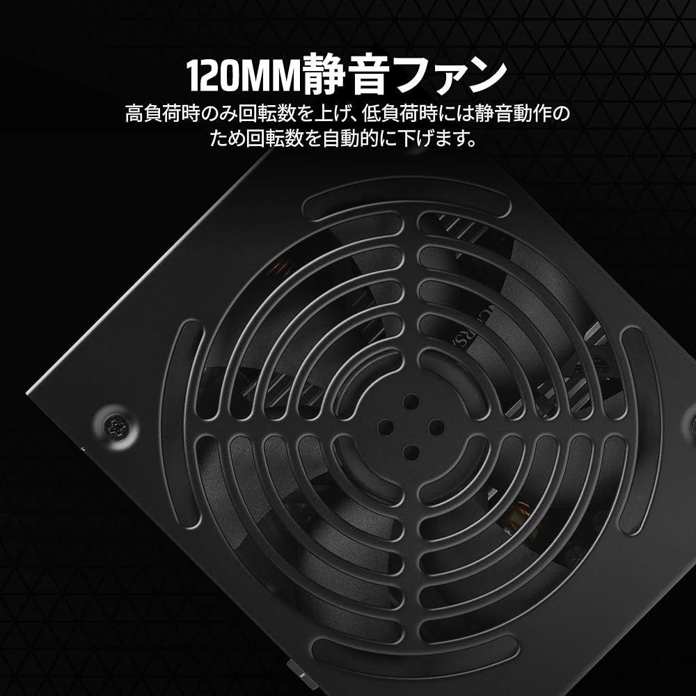低ノイズ冷却:熱コントロール式の 120mm 低ノイズ冷却ファンは、電源に強い負荷がかかるときにだけ高速で回転し、低負荷時には減速してほぼ静音で動作します。