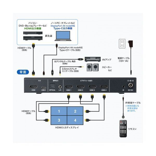 インターフェース:入力用:HDMIタイプA(19PIN)メス×1・USBType-Cメス×1、出力用:HDMIタイプA(19PIN)メス×4、音声出力:Toslink×1・3.5mmステレオミニジャック×1、赤外線リモコン用:IRジャック×1