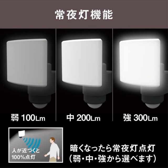 常夜灯: 100ルーメン (弱) 200ルーメン (中)、 300ルーメン (強)