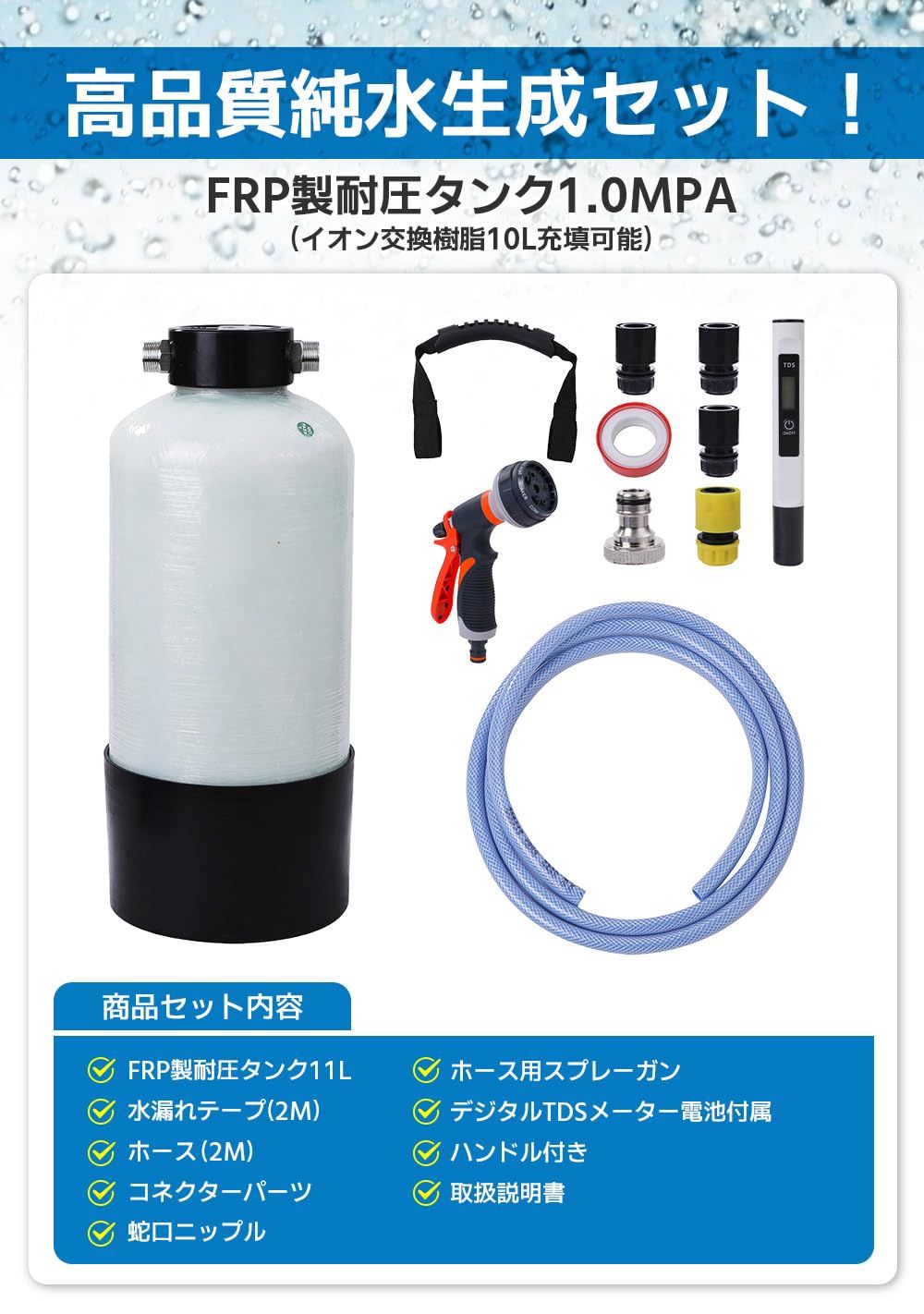 ◆セット内容◆・FRP製耐圧タンク 11Lイオン交換樹脂10L ・防藻・耐圧・耐寒ワンタッチコネクター付きホース2.5m(タカギ等対応品) ・デジタルTDSメーター 電池付属(セット済み)・純水器取っ手 ・ゴムキャップ×2個 ・スプレーガン・水漏れテープ(2)・取扱説明書