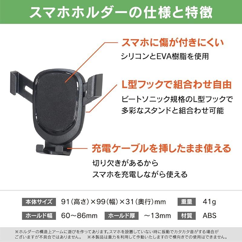 ○仕様:ホルダー本体サイズ:91(高さ)×99(幅)×31(奥行)mm/ホールド幅:60~86mm/ホールド厚:13mm/スタンド本体サイズ:W50×H50×D178(mm)