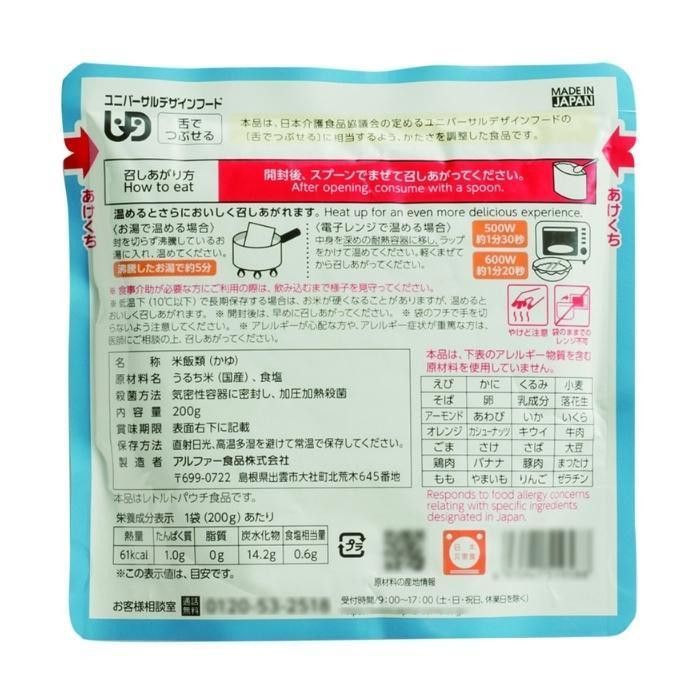 水不要、食器不要、調理不要!食物アレルギーをお持ちの方や、そしゃく機能にも配慮した長期保存食です。原材料はうるち米と塩のみ。国産米を100%使用し、程よい塩加減で食べやすい味わいに仕上げました。