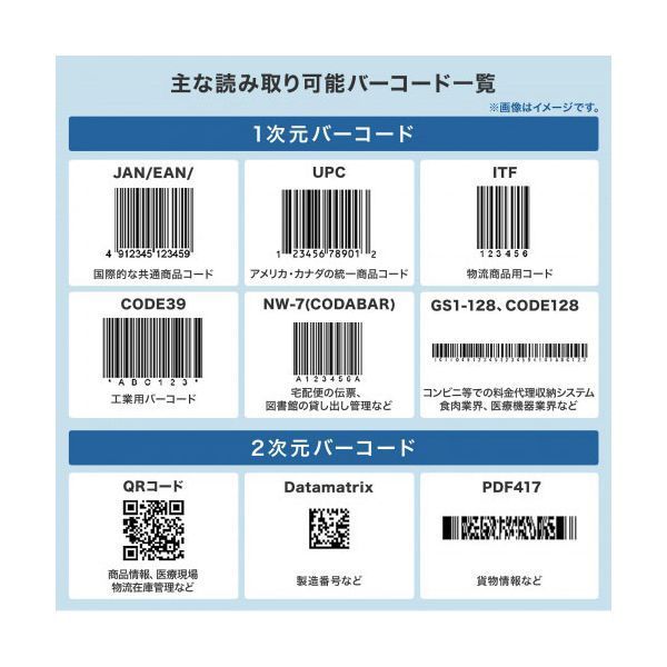 ■読取可能コード(1次元):EAN-8,EAN-13,UPC-A,UPC-E,NW-7(Codabar),Interleaved2of5(ITF),Industrial2of5,Matrix2of5,Code11,Code32,Code39,Code93,Code128,ISBN,MSI,GS1Databar,GS1DatabarLimited,GS1DatabarExpanded,Paramecode