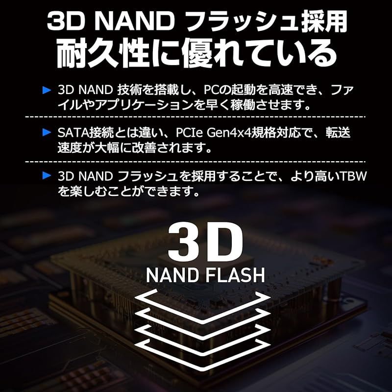 PCの起動を高速でき、ファイルやアプリケーションを早く稼働させます。SATA接続とは違い、M.2(M key)規格対応で、転送速度が大幅に改善されます。より高いTBWを楽しむことができます。