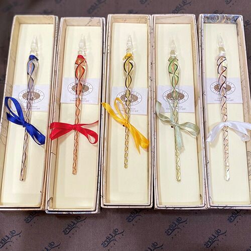 詳細情報イタリア・ルビナート社のガラスペン。インクに直接ペン先を浸すことにより文字を描くことができるペンです。使い終わったら水で洗って、水気をふき取り、箱にしまうだけなので簡単にお手入れが出来ます。