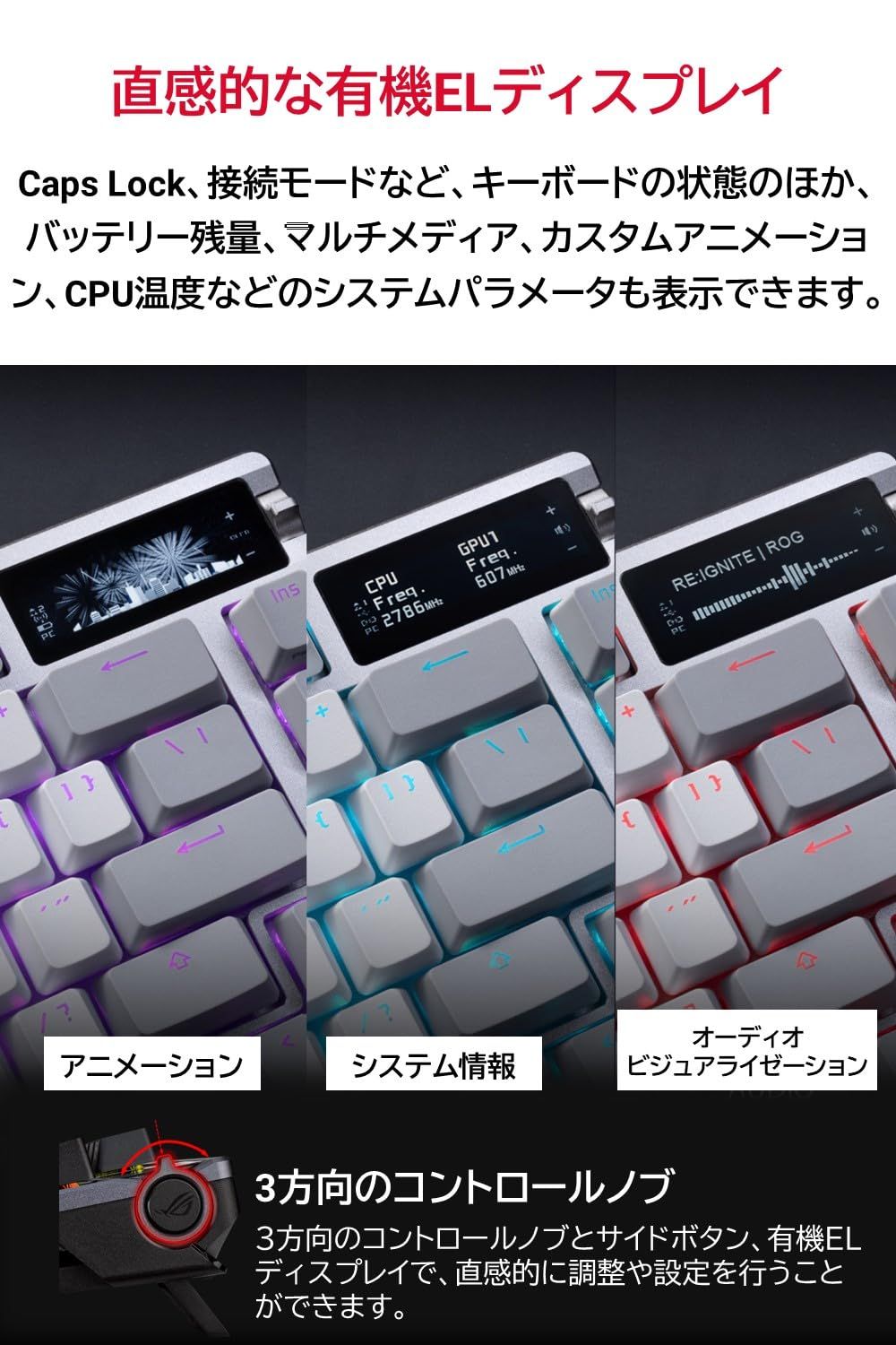 、有線USBの3つの接続方法に対応有機ELディスプレイと直感的なコントロール:システム情報やキーボードの設定を一目で確認でき、3方向のノブで手軽に設定を変更ホットスワップ対応ROG