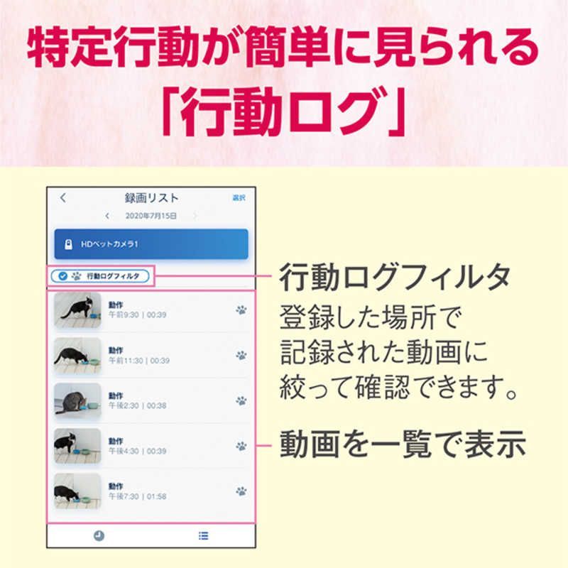 登録した場所で撮影されたペットの様子をまとめて確認できる 行動ログ※8 や、1日1動画をランダムに選出し先頭の5秒間を抽出。最大7日間分を合成しダイジェスト動画を再生する 一週間ダイジェスト※9 などの便利機能を搭載。
