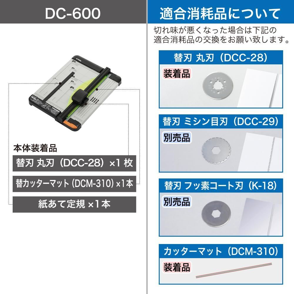 【本体装着品】替刃…DCC-28(丸刃)、カッターマット…DCM-310(1本)/紙押さえ定規(1本)【別売】DCC-29(ミシン目刃)/K-18(フッ素コート刃)