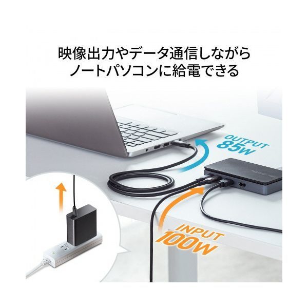 ●USBPowerDelivery(USBPD)規格の最大20V/5A(100W)までの入力に対応し、別途USBPD規格に対応したACアダプタを接続することで本製品から映像出力、データ通信を行いながら同時に接続のノートパソコンへ給電を行うことができます。