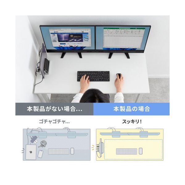 ●ノートパソコンスタンドとドッキングステーションが一体型になっているので、デスクに省スペースに設置することができます。