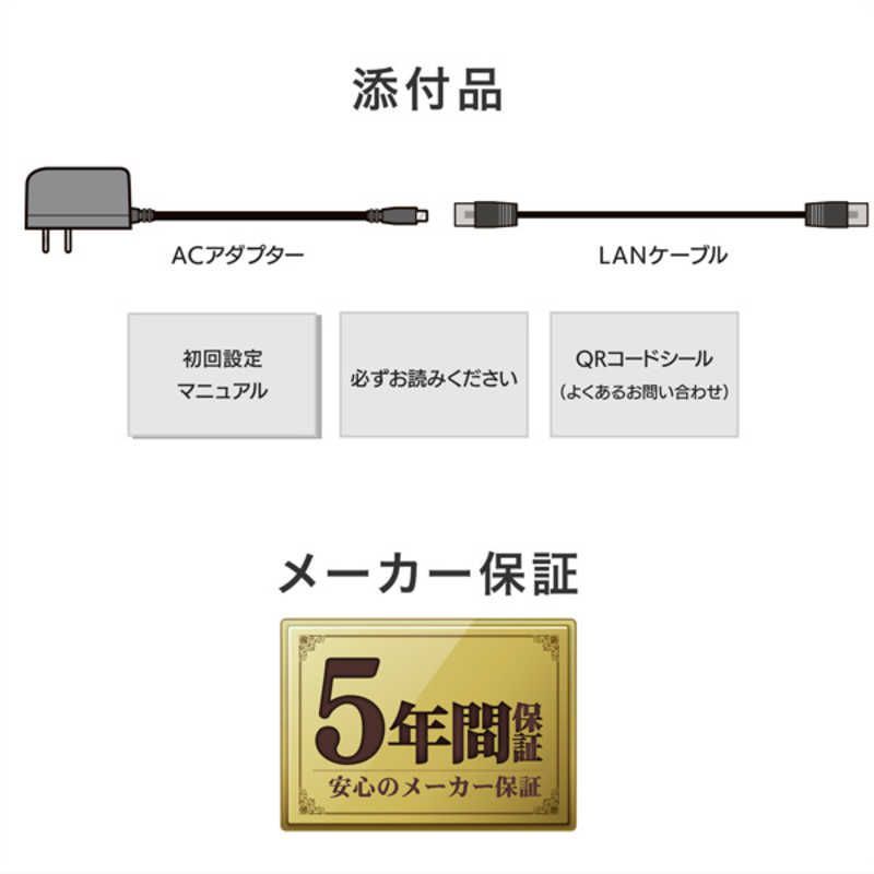 付属品:必ずお読みください、初回設定マニュアル、ACアダプター、LANケーブル、QRコードシール(よくあるお問い合わせ)