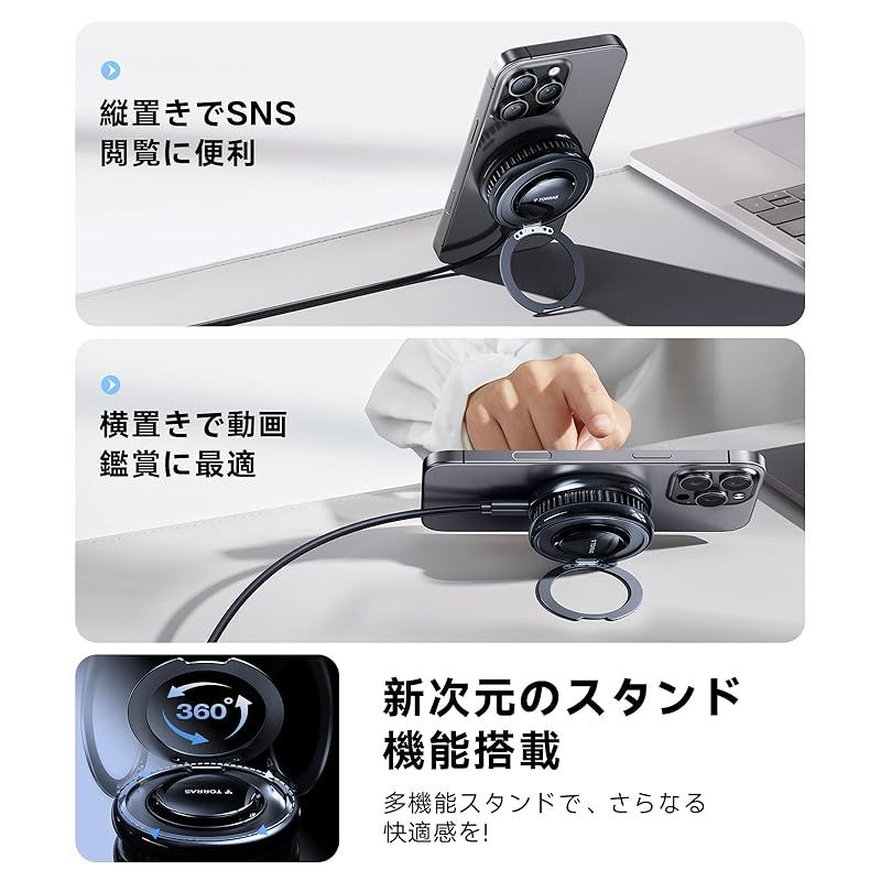 【360°回転スタンド・ 革新的で実用的】 360°スムーズ回転スタンドで使用シーンに合わせてお好みの角度に調整可能です。横向きで動画やゲームを楽しんだり、縦向きでオンライン会議や仕事をしたりと、これ一台で仕事もプライベートも充実した充電ライフをサポートします。アルミ素材を採用しており、軽量で耐久性に優れており、長期間の使用でも変形などの心配が少なく、安心してご使用いただけます