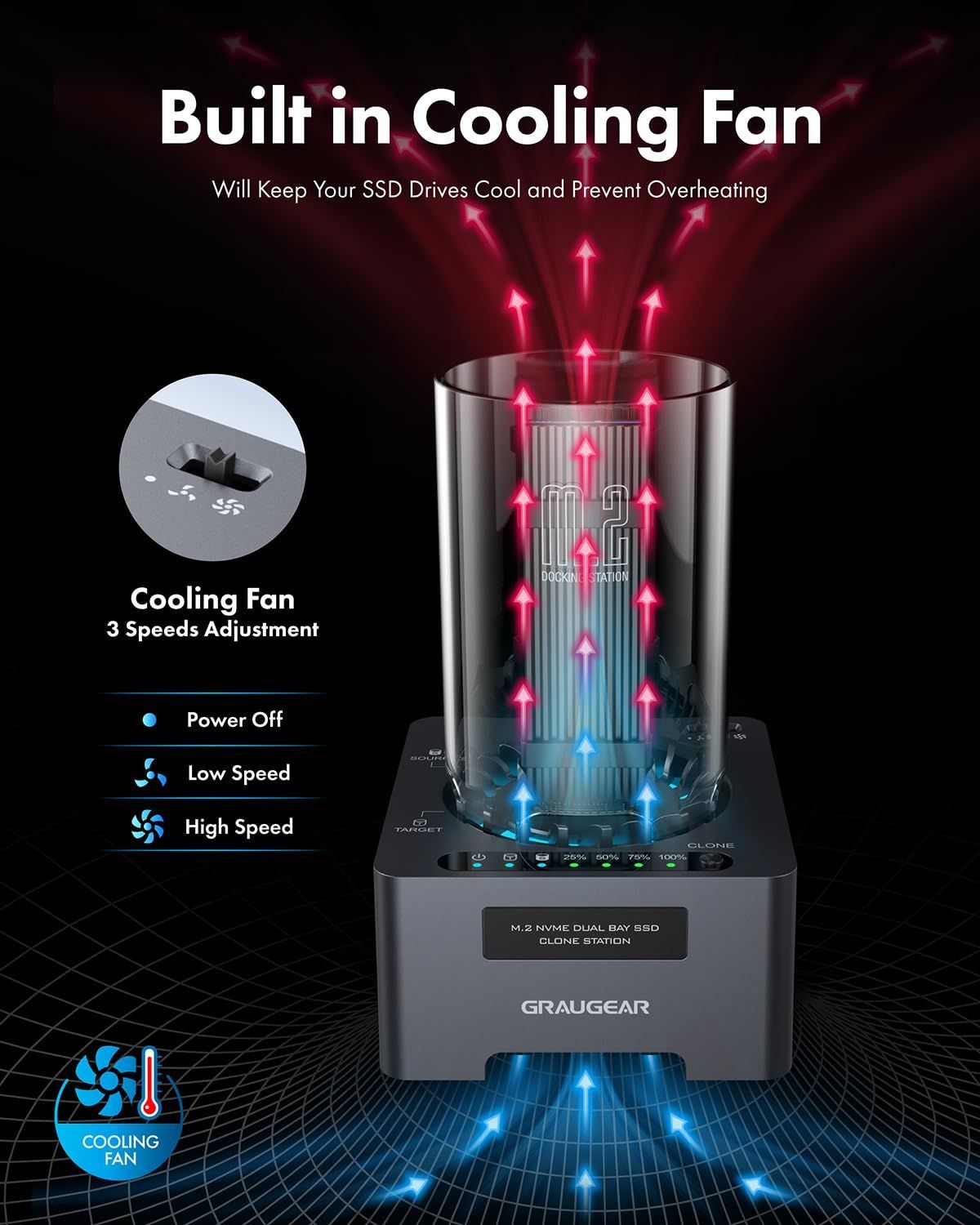 【効率的な放熱】内蔵の3速冷却ファンによるアクティブ放熱とアルミニウムヒートシンクによるパッシブ放熱の組み合わせにより、M.2 SSDから発生する熱を放散します。 SSDを過熱から効果的に保護し、高い転送速度を維持します。