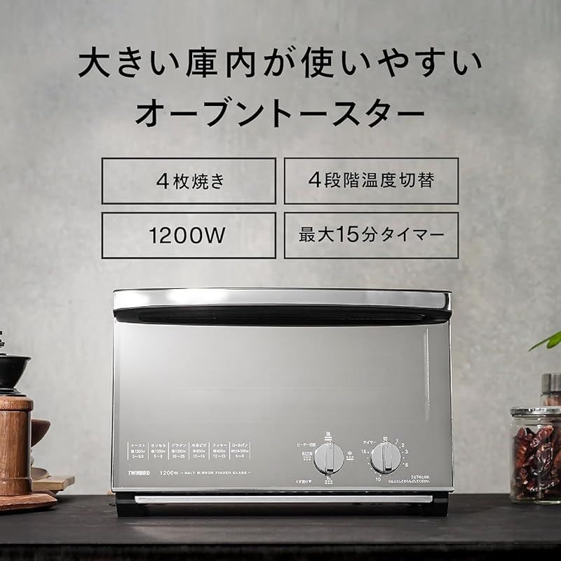 商品名:TWINBIRD(ツインバード) トースター オーブントースター 4枚焼き ピザ丸々入る広さ 1200W 15分タイマー 出力切替4段階 ミラーガラス 掃除しやすい スタイリッシュ ブラック TS-D047B