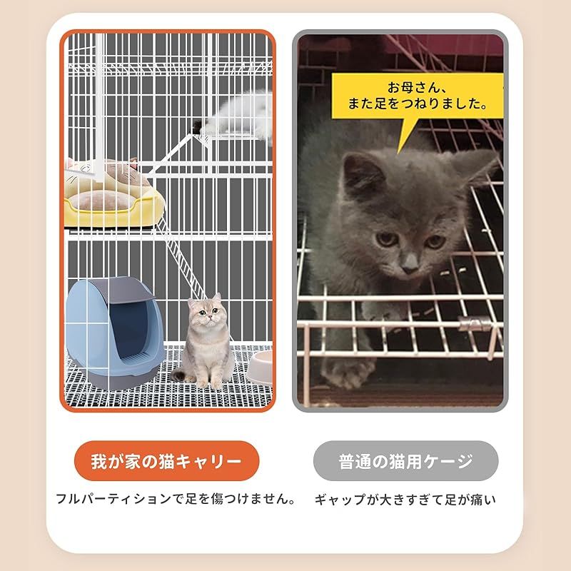 【猫が安心自由に活動できる場所】この猫用ケージは、子猫が脱出した後ケガや交通事故などのトラブルを防ぎます。安全で快適な休息場所を作り、猫を怪我から守ることができます。広々としてフレキシブルなので、多頭飼いの方にも使いやすいと思います。ケージは多数の娯楽施設があり、猫の遊び場として、またベッドやおもちゃを置いたくつろぎスペースとしても適しています。金網から外が見えるので、ペットの不安を解消し、猫が寂しさを感じることなく、飼い主の様子を常に確認することができます。また、飼い主もいつも状況を確認することができ、猫の健康と安全を確保することができます。