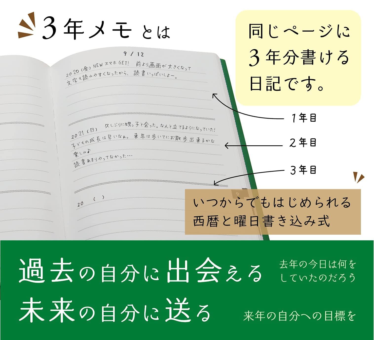 いつからでもはじめられる日付書き込み式、1年後に過去の自分に出会えます。