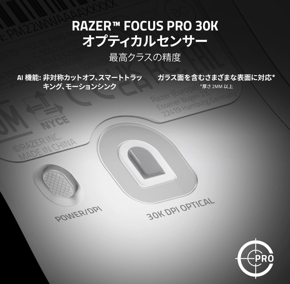 【Razer Focus Pro 30K オプティカルセンサー】前モデルのセンサーより正確なトラッキング/進化したAI機能/ガラス表面にも対応と、究極までに洗礼されたセンサーとなっており、より高い精度でのマウス操作が可能になっています。